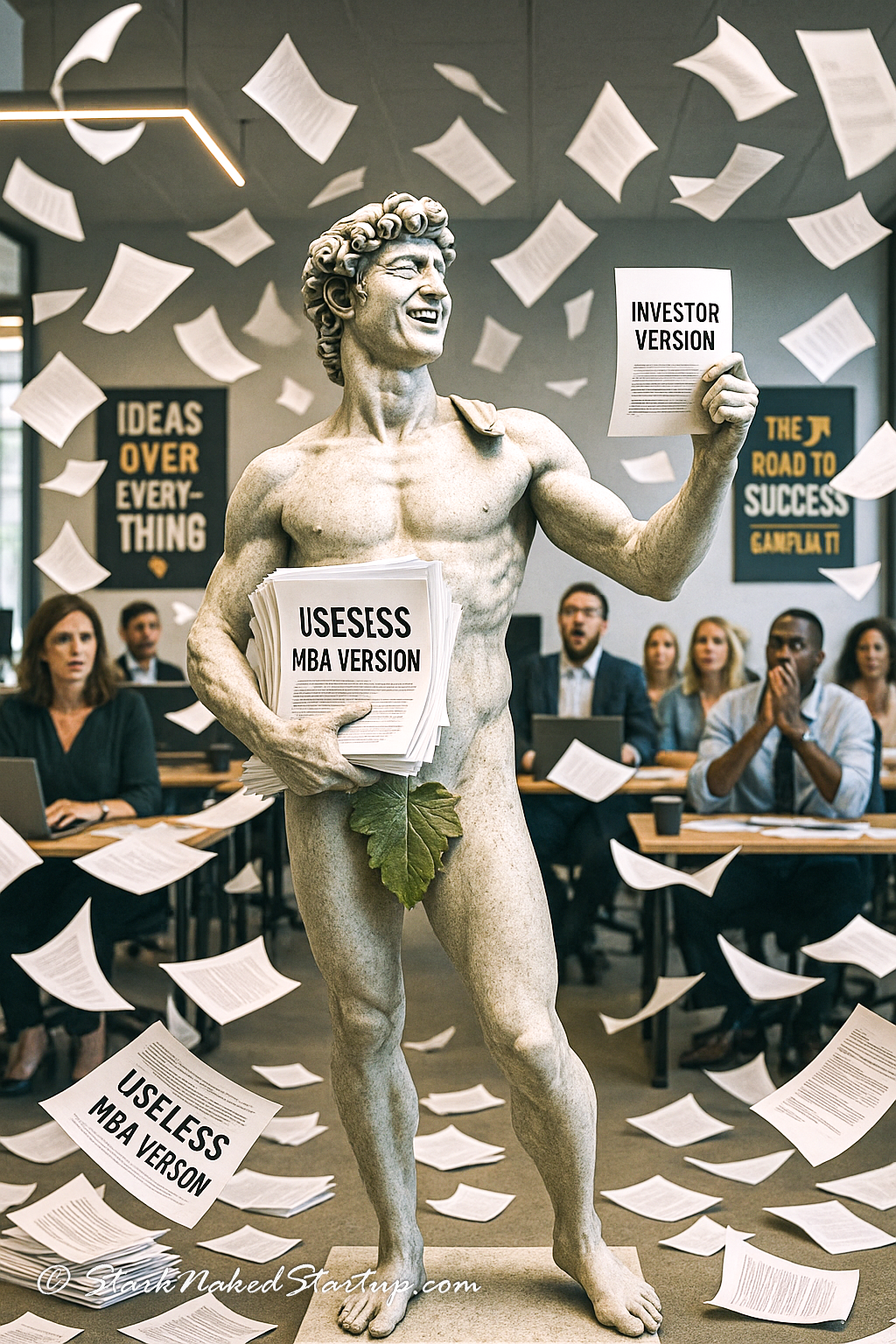 Not the Stark Naked Startup, heavily flawed Fig Leaf version. Not the 100-page MBA version. This is a lean, sharp, investor-specific story that answers the only question that matters: “Why should I give you money instead of someone else?”